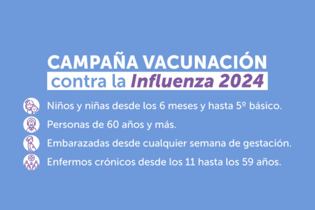 El Ministerio de Salud dio inicio el 13 de marzo de 2024 a la campaña de vacunación contra la Influenza, la que está dirigida a grupos de la población definidos, debido a su riesgo de sufrir complicaciones severas de la enfermedad. La influenza es una enfermedad grave y contagiosa, causada por un virus que se transmite al toser, estornudar o por secreciones nasales. Las complicaciones de este mal pueden llevar a la hospitalización e incluso provocar la muerte; ejemplos de complicaciones graves son la neumonía y la bronquitis severa. Asimismo, la influenza también puede ser causa de complicaciones de ciertas enfermedades como la diabetes, el asma y las enfermedades cardíacas o pulmonares.