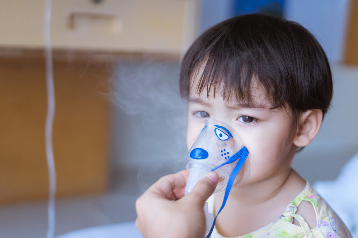 Little Asian boy under anesthesia with an oxygen mask in hospital.