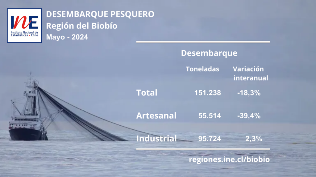 Un decrecimiento de 18,3% registró el desembarque pesquero en la Región del Biobío en mayo de 2024, totalizando 151.238 toneladas, cifra inferior en 33.961 toneladas, incidido principalmente por la menor captura de pescados (-20,7%), de acuerdo a lo informado por el Instituto Nacional de Estadísticas (INE).