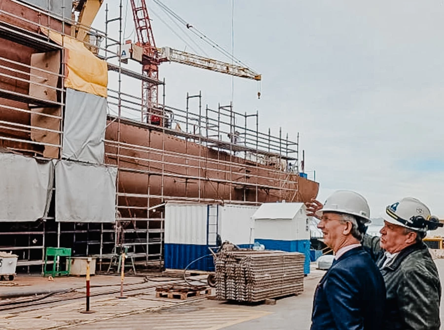 El embajador Frances en la grada de Asmar Talcahuano contempla el avance de la construcción del primer buque multipropósito del proyecto Escotillón IV.