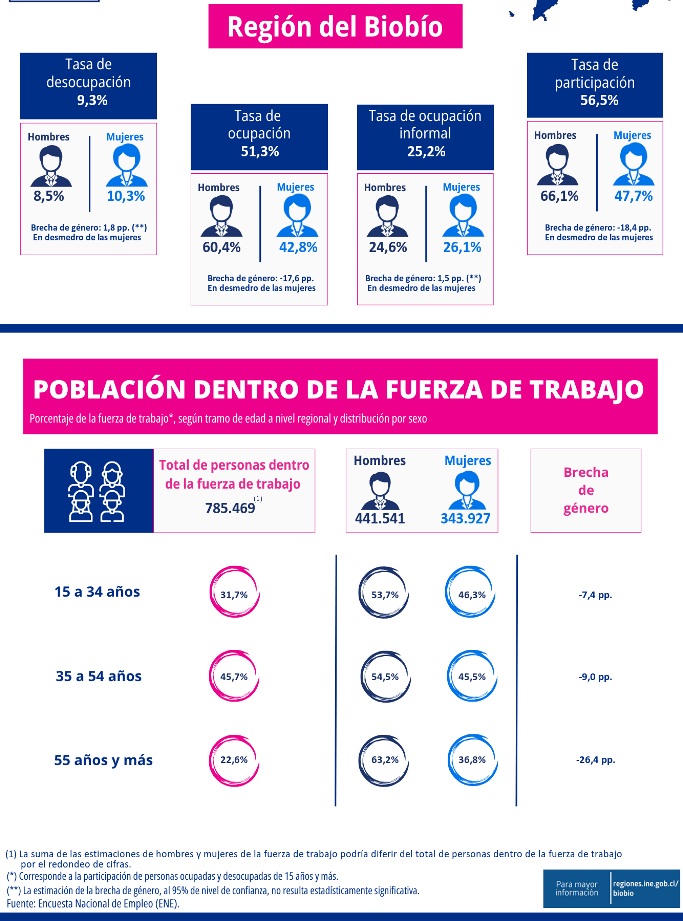 La estimación total de personas ocupadas en la Región del Biobío experimentó una disminución del 0,6% en doce meses, principalmente incidida por la reducción de ocupación en los hombres (-1,9%).