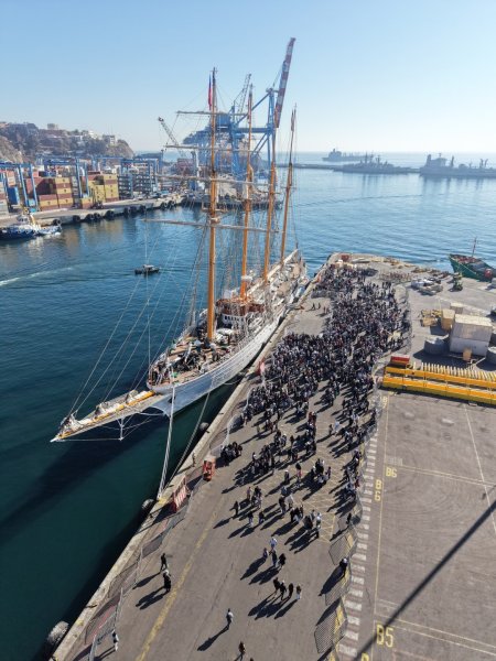 Desde el sitio 6 del Terminal Portuario Valparaíso (TPV), zarpó, cerca del mediodía de este sábado 25 de abril, el Buque Escuela “Esmeralda” para dar inicio a su 70° Crucero de Instrucción. Como ya es tradicional, la “Dama Blanca” fue despedida por los pitos y sirenas de las naves surtas en la bahía, junto a embarcaciones menores que la acompañaron por la costa, además de cerca de 1.700 personas, entre familiares y amigos que llegaron con banderas chilenas, globos y pancartas con mensajes de despedida. La dotación, al mando del capitán de Navío Edward Gibbons, está conformada por 269 personas, de las cuales 35 son mujeres. Además, participan nueve oficiales extranjeros invitados y cinco oficiales de las otras ramas de las Fuerzas Armadas, de Orden y Seguridad Pública.