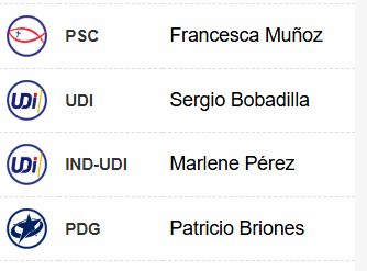 Candidato(a) Partido / Pacto Paz Charpentier REP Roberto Arroyo PSC Francesca Muñoz PSC Sergio Bobadilla UDI Marlene Pérez IND-UDI Patricio...